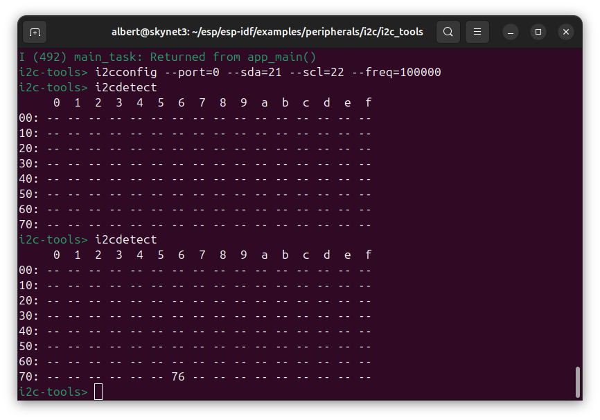 The I2C tools from ESP-IDF examples were used to test communication with the sensor device.