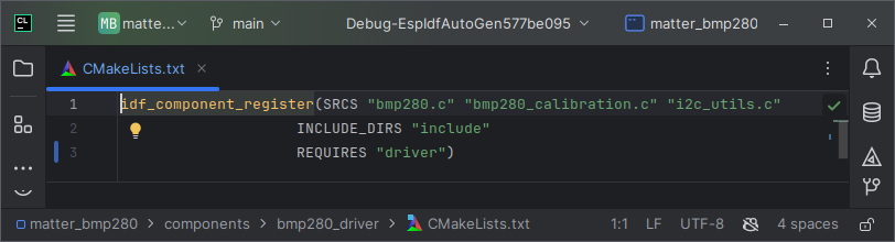 The ESP-IDF framework includes a driver for working with I2C devices. To ensure that this component can use the driver, the REQUIRES directive must be added to components/bmp280_driver/CMakeLists.txt as follows:
